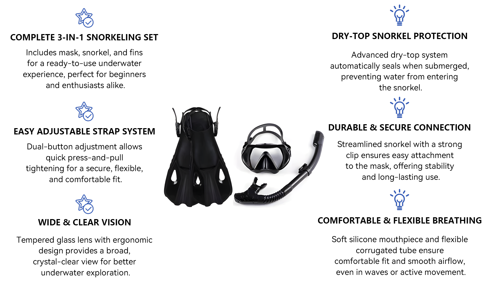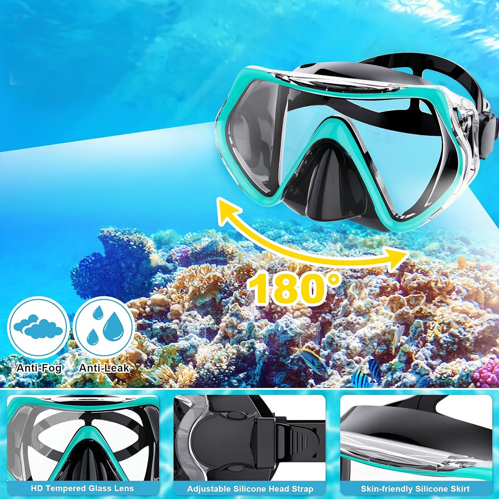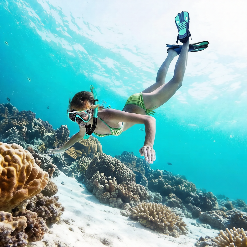 It includes a complete snorkeling kit with a mask, snorkel, and fins for a ready-to-use experience.
