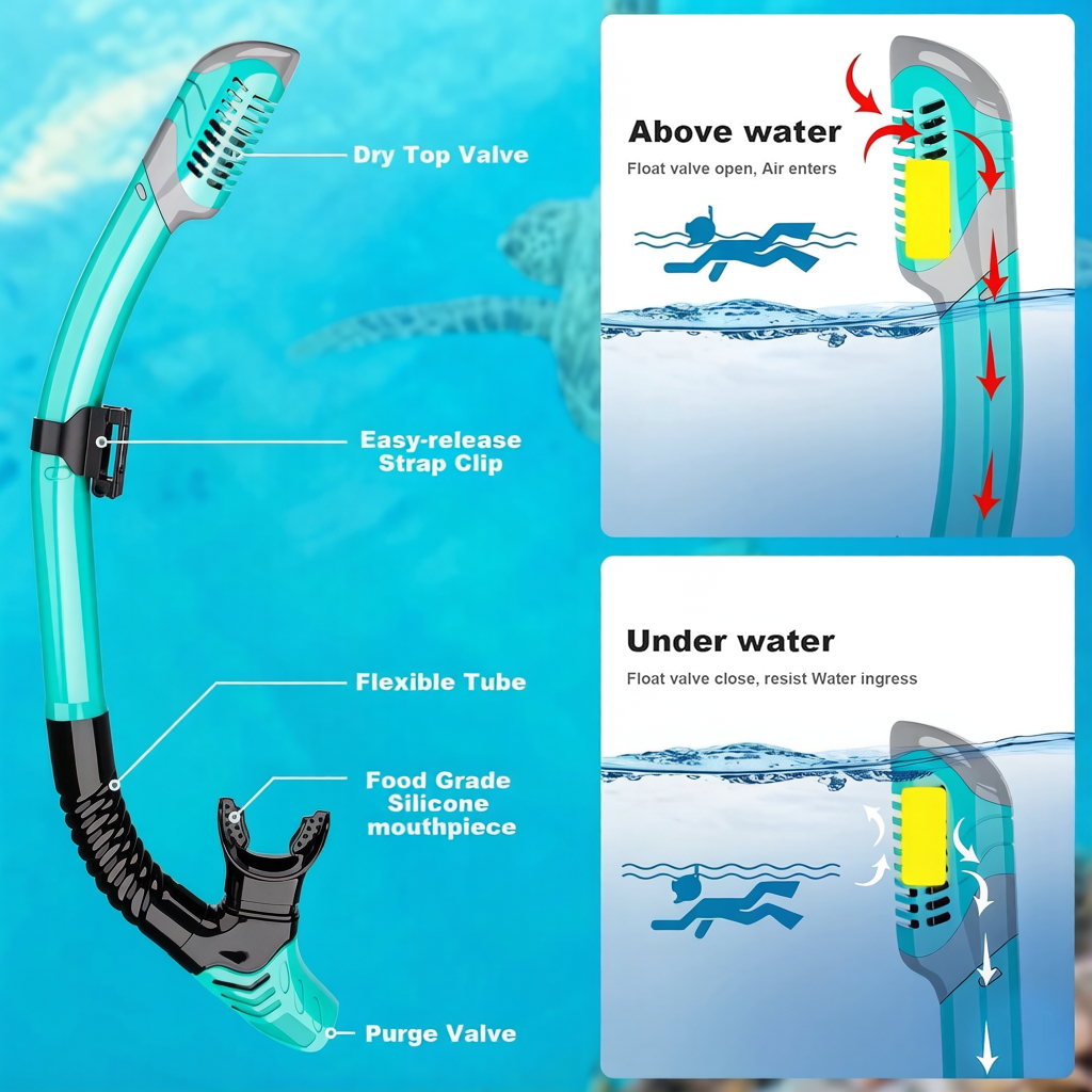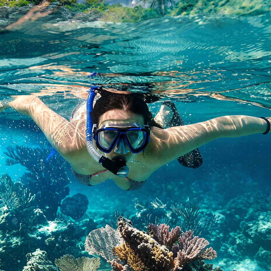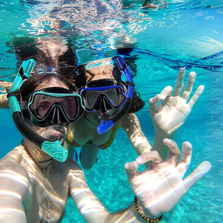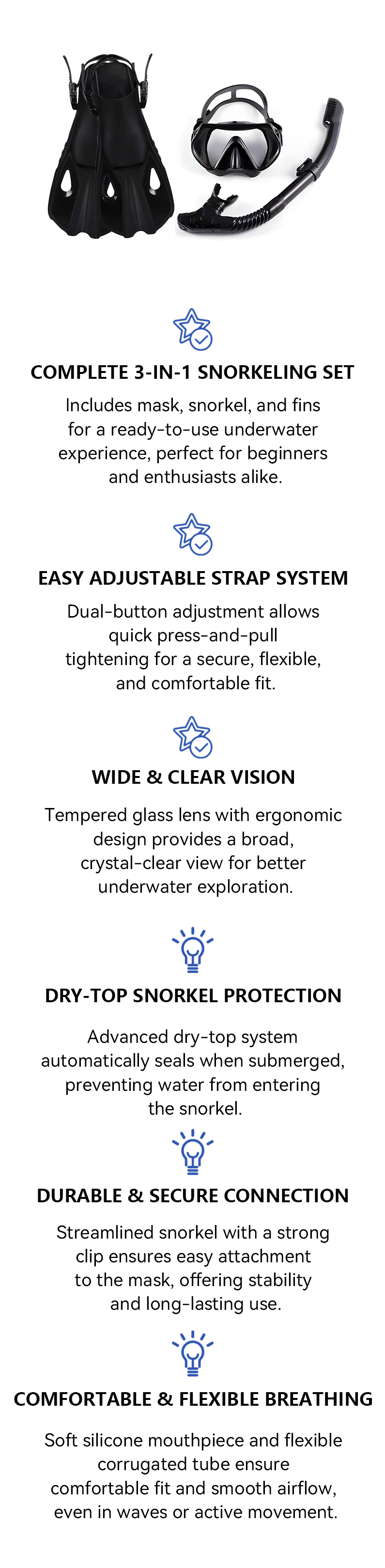 It includes a complete snorkeling kit with a mask, snorkel, and fins for a ready-to-use experience.